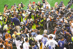 |    据新华社洛杉矶7月21日电(记者林媛)洛杉矶银河队21日在主场迎战英超劲旅切尔西队,2.7万名球迷到家库体育中心目睹了贝克汉姆在银河队的“处子秀”。右脚踝仍然水肿的贝克汉姆上场15分钟,未能给银河队做出太多贡献。切尔西队最终以1∶0战胜银河队,赢得了他们季前热身赛的第二场胜利。    虽然贝克汉姆并没有首发上场,但有几万球迷的现场助威,银河队在“蓝军”面前表现得毫不畏惧,多诺万、琼斯等多次在切尔西队门前制造险情,而守门员乔·坎农也表现不俗,三次将皮球扑出门外。45分钟的较量后,双方战成0∶0。下半场切尔西队开始发力,第48分钟时,脚趾受伤的特里混战中在禁区前一脚劲射,敲开了银河队的大门。    比赛进行到第65分钟时,一直坐在板凳席上的贝克汉姆开始在场边做热身活动,第78分钟时,贝克汉姆终于身披银河队23号战袍上场。然而,受伤的脚踝明显影响了他的场上表现,15分钟的比赛中,他仅在小范围内奔跑和传球,并没有让球迷们领略到世界足球巨星的风采,更糟糕的是,他还两次被切尔西队防守队员铲倒在地。“蓝军”切尔西队最终以1∶0取胜。    赛后贝克汉姆对记者说:“能和切尔西队一起比赛令人很兴奋,很高兴我今天能够上场,但我的脚踝还是很痛,可能今后两个星期都不可能再上场比赛了。”    除贝克汉姆的妻儿及好友在球场包厢里观看比赛外,加州州长施瓦辛格也来到现场助阵,他对记者说:“一般来说,美国的孩子们喜欢打橄榄球、棒球和篮球,很高兴今天能见到这么多人来看足球,对美国的足球市场来说,这的确是个很好的转变。”    据银河队消息,这场比赛的所有球票早在一周前就被全部售出,票价从60美元到500美元不等,这也是银河队近年来最挣钱的一场比赛。比赛现场能够云集几万名观众,这在美国足球大联盟的比赛中的确并不多见。    照片:7月22日,英格兰球星贝克汉姆上演了加盟美国银河队的处子秀。图为大批记者围住替补席上的小贝。国新摄     |