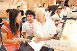 7月22日,北京同春园饭店,大学生保姆与雇主攀谈。当天,来自北京和四川30多所高校的100多名经过家政专业培训的在校大学生,参加由北京家政服务协会主办的大学生暑期家政才艺展示暨双选会。这些大学生保姆进行个人才艺表演的同时,还与到场的雇主互动交流。赵晶摄