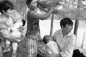 7月21日,淮河花园湖行洪区内迁出的灾民在一个水塘旁的高地上安家。为了防止夜间蚊虫的叮咬,一户村民还专门在床铺上