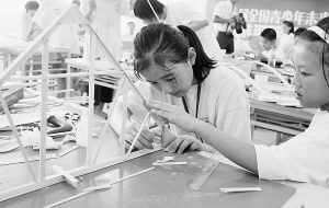 7月26日,第四届全国青少年未来工程师博览与竞赛在苏州举行,苏州代表队的学生在“木梁承重”竞赛中制作木梁。