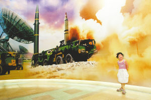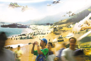 ▲展厅内环绕的巨幅图片为观众展示了现代化的海陆空一体化作战。本报记者郑萍萍摄