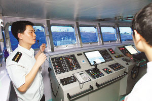 ▲在海军多功能舰艇操作训练模拟系统中体验“驾驶”舰艇。为了激发观众参观的兴趣、增强与观众的互动,展览设置了一些观众参与项目。本报记者李建泉摄