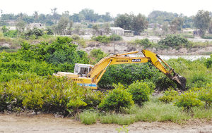 7月26日,一台挖掘机正在红树林丛中挖掘。海南省三亚市三亚河上游金鸡岭一带的红树林湿地是三亚河红树林保护区(市级保护区)的一部分,2007年年初,这里被批准为商业住房开发地。目前,大规模工程建设正在展开,珍贵红树林湿地遭到严重破坏。