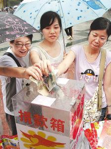 几位重庆市民冒雨为重庆灾区捐款。当日,重庆市慈善总会等单位在重庆解放碑商业区,为在暴雨洪灾中受灾的群众举行慈善募捐活动。重庆市7月中旬遭受暴雨洪灾袭击,造成重大人员伤亡和经济损失。目前灾区已接收到社会捐赠款近9000万元。 新华社记者 杨磊摄