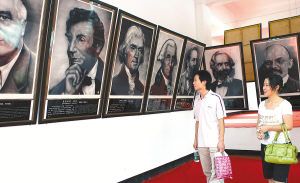 7月26日,为期10天的首届“世界名人肖像粉墨画”展在广州大学城博物馆落幕。118名政治风云人物、文豪墨客、发明家和科学巨匠的肖像栩栩如生,逼真传神。这些肖像作品,均为美术师张松柏创作。 本报记者 刘占坤摄