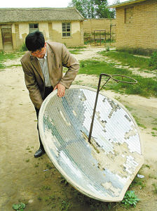 ▲7月18日,寨科乡畜牧站站长李湛在畜牧站院里摆弄坏了的太阳能热水灶。