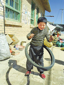 ▲寨科小学的孩子和她的轮胎“呼啦圈”。