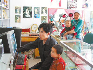 ▲乡里的数码摄影师一家租了乡政府的一间房子当做婚纱摄影室。同一间屋子,也是他爱人的理发室,做“新娘盘头”。