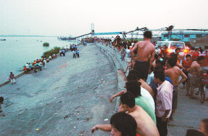 8月2日,大批群众在钱塘江边等待失踪者的消息。当日,在杭州下沙七堡一丁字坝附近,发生钱塘江潮水卷人事件。据杭州市公安局现场搜救人员称,有30多人在江堤玩耍时被卷走,其中22名落水者已被救起。目前,已确认有两人失踪。 新华社记者 王定昶摄