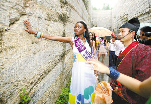 8月6日,在河南省永城市芒砀山,参加2007国际旅游小姐冠军总决赛的佳丽在触摸2000多年前的西汉墓道,这里是史学界公认的汉兴圣地、汉文化遗存富集之地。王勇摄