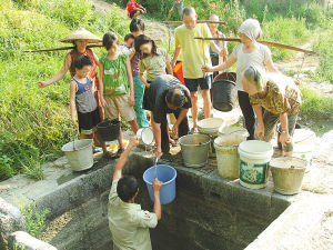 8月7日,湖南省邵阳县黄荆乡南山村村民在井旁排队取水。由于持续干旱少雨,进入7月份后,湖南省湘中及以南地区旱情迅猛发展。目前湖南省已有一半以上的面积出现不同程度旱情。李爱民摄(新华社发)