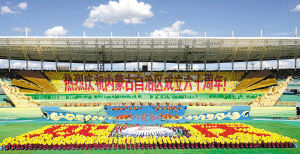 照片:8月8日,内蒙古自治区成立60周年庆祝大会在呼和浩特体育场举行。这是《草原赞歌》大型文艺演出表演现场。