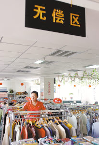 8月10日,长春市朝阳区扶贫超市售货员在无偿区内整理全区机关干部捐献的衣物。这个扶贫超市自2003年成立以来,朝阳区每年在这里投入200万元帮助贫困居民。目前,全区已有6700户贫困家庭办理了扶贫超市供应证,每户可凭证每月按进价的八折购买100元的商品。此外,超市还为其中1500户特困家庭每年发放300元扶贫超市购物券,深受贫困群众欢迎。