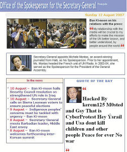 8月11日,联合国秘书长潘基文发言人的官方网页被黑客篡改,包括用来发布潘基文官方声明在内的网页许多地方都被加上了反战口号。