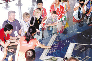 8月13日,“奥运家庭”成员正在青岛奥帆中心鸟瞰模型前参观。当日,参加“奥运家庭游北京”活动的10个奥运家庭来到青岛奥帆中心参观游览,近距离感受青岛日渐浓郁的奥运氛围。