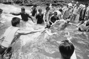8月12日,贵州省桐梓县木瓜镇水银河旅游风景区,来自重庆的游客志愿者自发将受困游客转移到安全地带。一场暴雨后,波光粼粼的贵州水银河水位陡涨数米。近千重庆自驾车游客在水银河漂流时遭遇了诸多险情:救生衣不足、浅滩变成急流,被困水中。