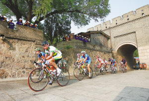 8月18日,选手们骑着自行车从北京八达岭长城下经过。当日,“好运北京”2007国际公路自行车邀请赛在北京举行,来自18个国家和地区的车手参加了比赛。本报记者陈剑摄