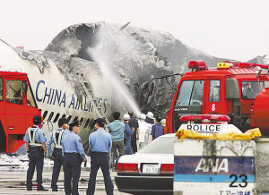 日本当地时间8月20日上午10时34分(北京时间9时34分),中国台湾“中华航空公司”的一架波音客机在日本冲绳那霸机场着陆后不久发生爆炸起火,机上165人现已全部安全脱险。图为事故救援现场。国新摄