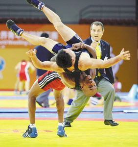 8月22日,在2007年世界青年摔跤锦标赛男子古典式摔跤55公斤级比赛中,古巴选手阿纳切·拉莫特(红)战胜罗马尼亚选手蒙泰亚努。本报记者刘占坤摄