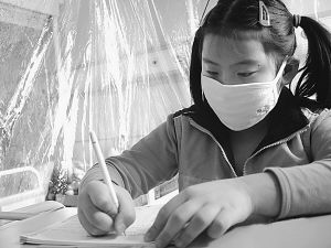 照片:笑笑在青岛治疗期间仍坚持学习 张欣摄