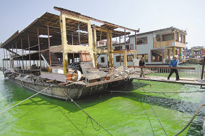 8月23日,工人们在拆除搭建在太湖中的无锡太湖马山水上餐厅建筑群。位于太湖之滨的江苏省无锡市,坐拥万顷碧波,有“太湖明珠”之称。2007年春天,太湖蓝藻突然暴发让这座城市200万市民经历了持续约一周的饮水危机。痛定思痛,无锡市最近规定,除了完善城乡污水处理系统、减少湖面养殖、再造湖滨湿地等措施外,城区内所有规模以下的“五小”企业(小钢铁、小水泥、小化工、小电镀、小印染)一律关闭,同时大力整治“三高两低”(高消耗、高污染、高危险、低产出、低效益)企业。截至目前,无锡市已关停323家小化工企业。一项通过转变经济增长方式、创新发展模式、全面根治污染源的铁腕治污行动正在无锡全面展开。新华社记者韩瑜庆摄