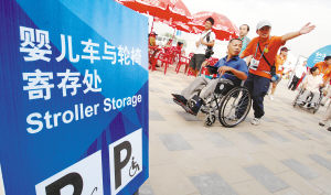 8月24日,北京市门头沟区的5名残疾观众应邀来到北京奥林匹克公园射箭场,对无障碍设施、安检、餐饮以及志愿者服务、紧急疏散等进行亲身体验,并提出改进意见。图为残疾观众李德滨对餐饮购物服务区进行测试。新华社记者格桑达瓦摄