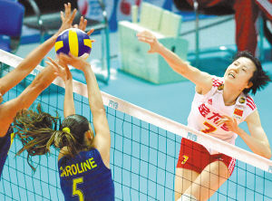 8月26日,2007年世界女排大奖赛总决赛,中国队以3∶0击败巴西队,从而以4胜1负的战绩夺得本次大奖赛亚军。新华社记者徐昱摄