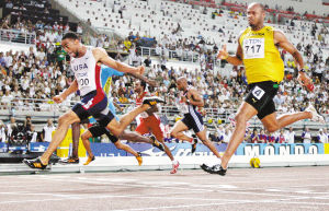 鲍威尔一直领先到最后15米,盖伊像一匹脱缰的黑马从他身边超过,鲍威尔尝到了被击垮的滋味,在终点线前又被阿特金斯抢先一步。