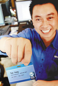 8月23日,杨涛在展示微软总部颁发的“微软最有价值专家”胸牌。