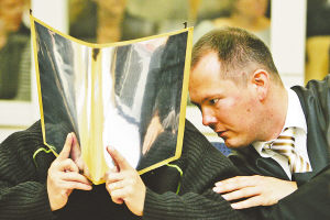 8月27日,在德国汉堡附近施塔德的一家法院,一名越南裔男子用文件夹挡住面孔,与律师(右)交谈。当天,涉嫌制造德国下萨克森州锡滕森中餐馆血案的5名越南裔男子在施塔德受审。本次庭审预计为期18天,判决结果可能要到11月中旬才能公布。