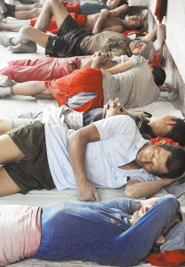 ▲下雨了,工人们倒地就睡,雨后还得接着干下一趟活儿。