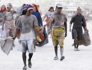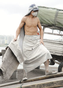 在这个小码头,湖南和四川籍的工人占了绝大部分,虽然是干体力活,但是每一个人都很瘦小。从广西、广东其他地区运来的水泥装在停靠在岸的货运船里,一有工地或者私人开车来买水泥,工头就会向一伙人报个数字,两吨或五吨,十几个工人就有次序地冲向货船,把水泥以接力的方式运到买主的汽车上。碰上大卡车来运货时,运水泥的场景更加壮观,几十个工人每人披一块自己制作的布头巾,红的、黄的、白的、花的,什么颜色的都有。头巾严实地扎在头上,顺着肩膀飘下来,在他们忙碌的身影中,风时而舞动他们多彩的头巾,甚至颇有异域风情。