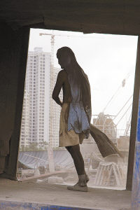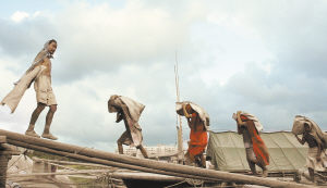 ▲干完几趟活儿,工人们就会把满身的水泥灰抖掉。