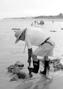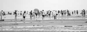 8月27日是农历十五逢大潮,海水从岸边退到了数千米外。厦门黄厝文昌鱼保护区仍有数百名市民,携带铁锹菜刀饭勺等工具,在海边随意挖沙采拾贝类。