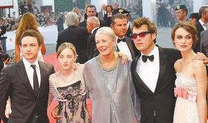 8月29日,在意大利北部城市威尼斯,电影《赎罪》剧组成员詹姆斯·麦卡沃伊、西尔莎·罗南、瓦妮莎·雷德格雷夫、乔·赖特和凯拉·奈特莉(从左至右)出席威尼斯电影节的开幕式。当天,第64届威尼斯电影节开幕,《赎罪》在开幕式上首映。