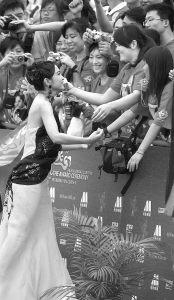 8月26日,第12届中国电影华表奖颁奖典礼在北京举行。17个奖项、50尊华表奖杯一一颁出。影片《云水谣》成为最大赢家,除获得优秀故事片奖、优秀导演奖外,该片男女主角陈坤、李冰冰分获本届华表奖影帝影后。图为李冰冰和影迷交流。 本报记者 刘占坤摄