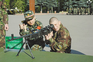 9月2日,在莫斯科郊外的俄罗斯内务部内卫部队独立作战师营区,中国军人向俄罗斯军人介绍中方武器装备。当日,中俄“合作-2007”联合反恐演习在莫斯科拉开序幕,中俄双方分组参观了对方的装备。这次演习是根据上海合作组织宗旨和中俄两国内卫部队有关协议,针对国际恐怖组织而进行的。正式演习为期3天,分为联合筹划、展开作战部署和实施联合作战行动三个阶段。新华社记者王作葵摄
