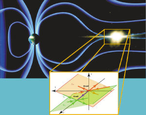 图为地球磁层的示意图以及欧洲空间局“星簇”(Cluster)卫星探测到的“磁重联”三维几何结构。黄色框内为“磁重联”三维几何结构图。新华社发(资料照片)