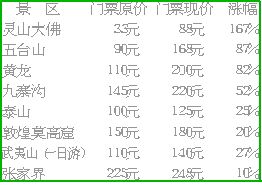 据了解,目前,包括张家界、九寨沟、三清山、庐山、崂山、曲阜三孔、泰山等热门景区(点),今年“十·一”期间争相挂出门票涨价牌,涨幅在20~150元之间。其中,五台山的门票更是由原来的90元上涨至168元,涨幅达87%,山西另一著名景点晋祠的门票从40元涨到了70元,九寨沟由145元飙升至220元加90元车费,人均310元,武夷山一日游的门票价格也从110元小涨到了140元。