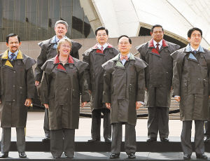 照片:9月8日,亚太经济合作组织第十五次领导人非正式会议第一阶段会议开始前,各成员领导人身着澳大利亚特色服装在悉尼歌剧院合影。新华社记者黄敬文摄
