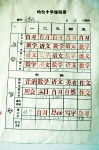 ▲哈岔小学校长方爱民的课程表,学校包括他在内只有两名教师,每天的课都排得满满的。