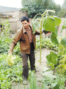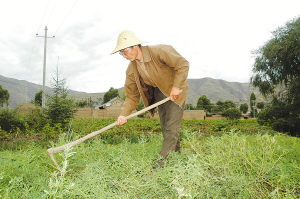 ▲方爱民在田里干活。他家里还有八分地,主要种黄芪和洋芋,每年收入1000多元。
