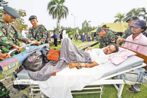 9月13日,在印度尼西亚明古鲁的一家医院外,参加救援的士兵帮助一名受伤的男子。当地时间12日18时10分(北京时间19时10分),印度尼西亚苏门答腊岛西部海域发生强烈地震,地震已造成至少9人死亡、50多人受伤。据印尼气象部门测定的地震震级为里氏7.9级,美国地质勘探局测定为里氏8.2级。另据我国地震台网测定,北京时间9月13日7时49分,在印尼苏门答腊南部海中(南纬2.5度,东经100.9度)再次发生8.3级地震。 新华社/法新