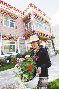 9月19日,西藏波密县扎木镇的村民尼玛在自家院子里养花。林芝地区是西藏自然资源最丰富的地区,近年来随着西藏农牧民安居工程的实施以及广东、福建两省的大力援助,林芝地区农牧民的生产生活有了明显的变化,成为西藏发展最快的地区之一。新华社记者普布扎西摄