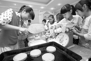 9月22日,农村留守儿童和城里孩子一起学做月饼。中秋佳节将至,河南许昌20多名农村留守儿童和城里孩子一起参加“相聚中秋,城乡同乐”活动,在糕点师指导下学习做月饼,感受传统节日文化。