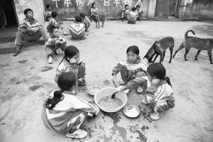 ▲孩子们蹲在操场上吃免费午餐。