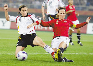 9月26日,在天津进行的2007年女足世界杯半决赛中,德国队以3∶0战胜挪威队,杀进决赛。郭新摄