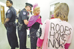 上图:9月26日,在美国华盛顿国会山,一名反战组织的成员(右二)被警方逮捕。当天,一些反战组织的成员在听证会上恳求美国国防部长盖茨停战撤军。新华社记者 张岩摄