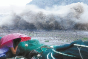 10月7日17时左右,强台风“罗莎”在浙江温州沿海登陆。洞头县洞头码头巨浪冲天,海浪击打着渔村码头,岸边波涛汹涌,浪高20多米。晓江摄