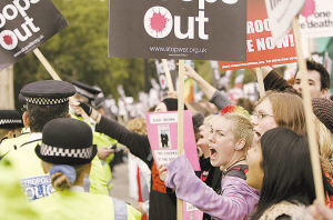 照片:10月8日,在英国首都伦敦市中心,抗议者在反战游行中手持要求政府撤军的标语牌,并高呼口号。当天,数百名抗议者在伦敦市中心举行反战游行,要求政府从伊拉克撤军。新华社/法新